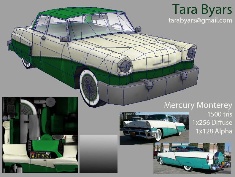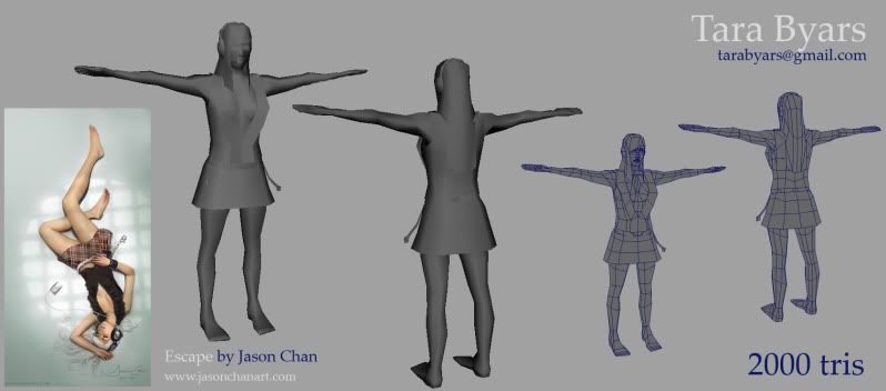 This was a speed test. I had two hours to model a character from a concept art in 2000 tris. I used 'escape' from Jason Chan (www.jasonchanart.com) In class I ended up with 1996 tris. But it was VERY rushed and looked HORRIBLE. There was only the ruffle of the shirt..and the hair....was just...not right. But this was because we had to be within 1990-2000 tris or we failed the test. So the whole time I was just trying to make sure that I got as much done within that limit. This weekend I have gone back and fixed up the geometry (especially the face) and got as much of the concept in as I could with my budget of 2000 tris, which I hit on the dot. I'm fairly happy, I think she could be a little slimmer but that's an easy fix for later.
